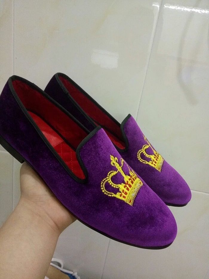 Purple Velvet Loafer Slip On Gold Embroidered Crown Patch Handmade Party Fashion Shoes