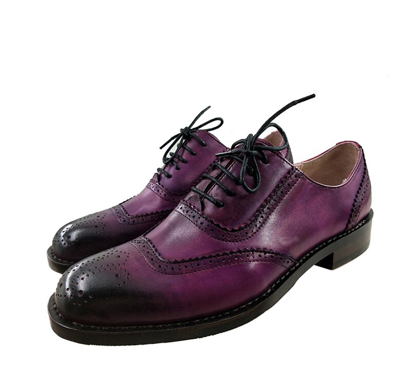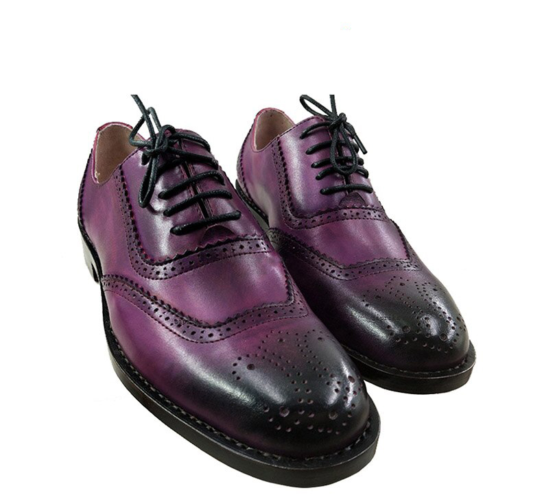 Purple Oxford Real Leather Rounded Burnished Brogue Toe Lace Up Handmade Shoes