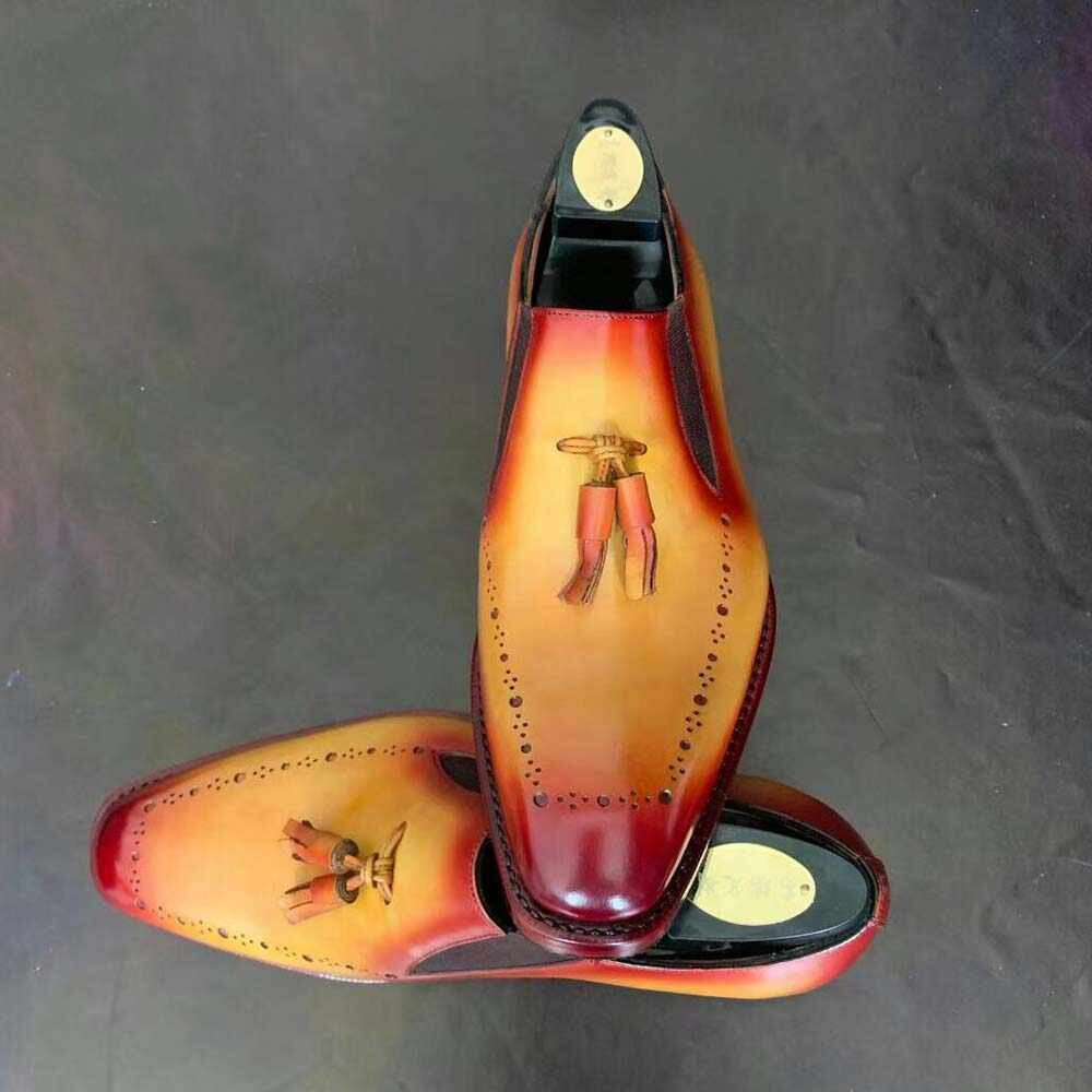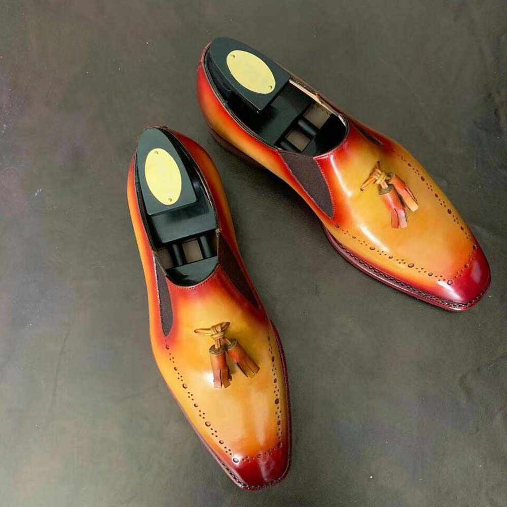 Tassel Loafer Slip On Maroon Tan Genuine Leather Rounded Burnished Derby Toe Handmade Shoes