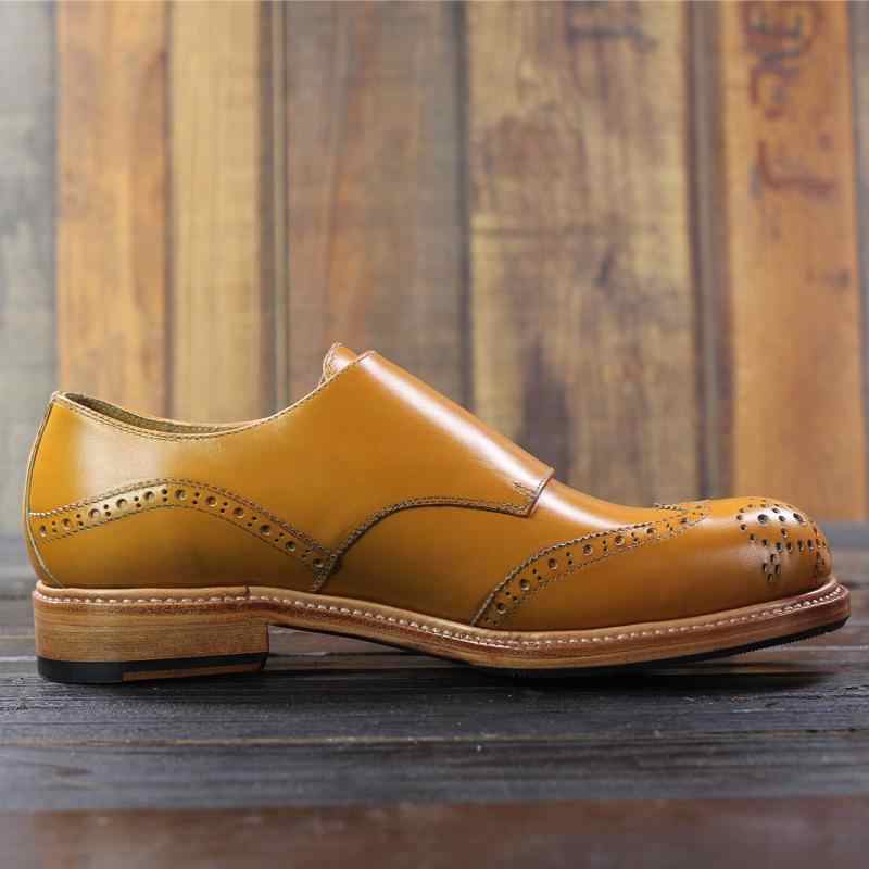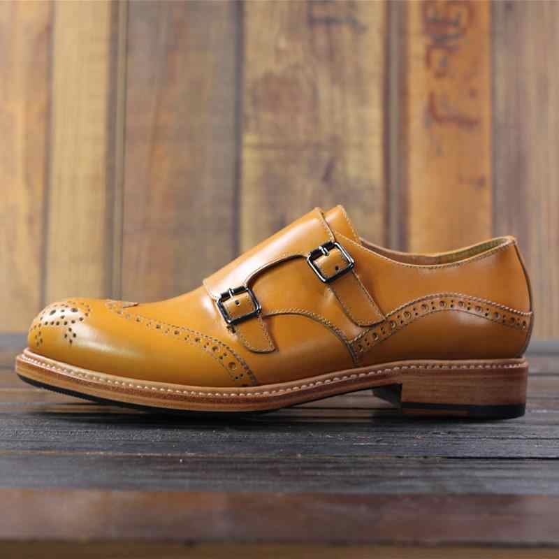 Monk Brown Double Buckle Strap Vintage Leather Wing Tip Brogue Toe Handmade Tan Sole Shoes