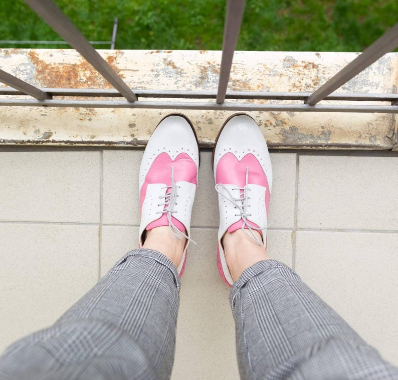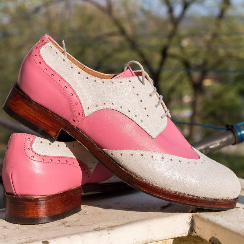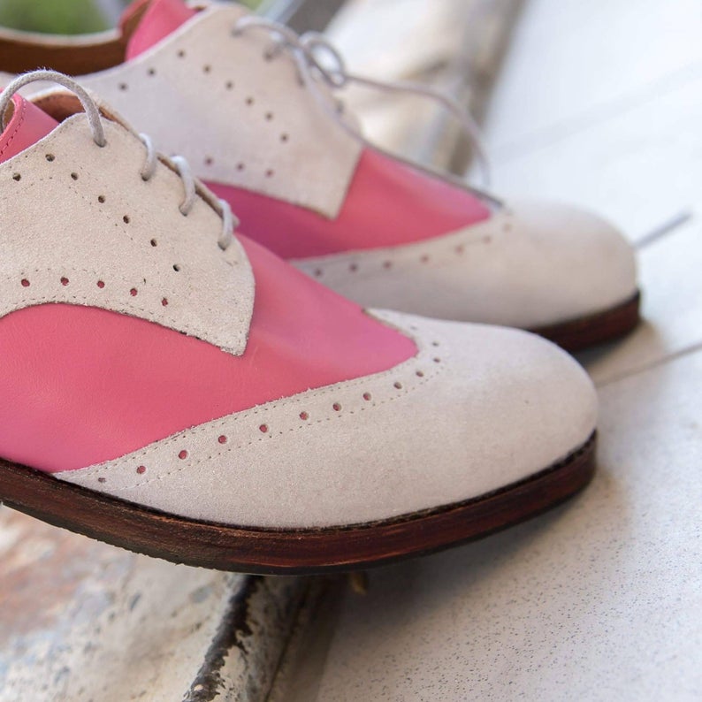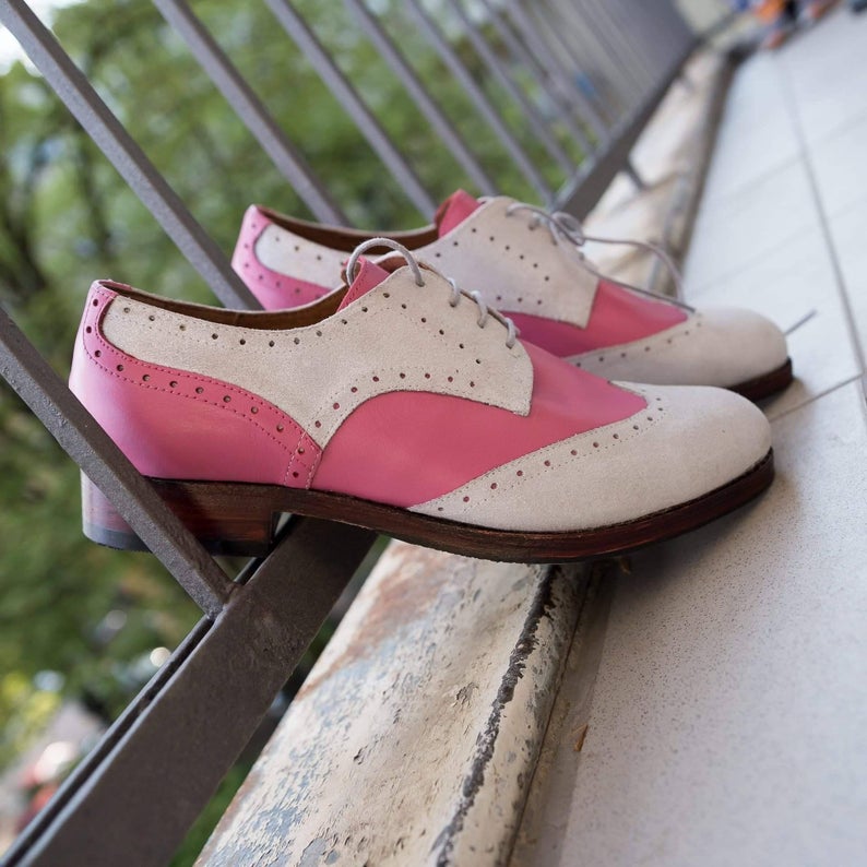 Two Tone Wing Tip Beige Pink Cont Rounded Derby Toe Handmade Vintage Leather Shoes