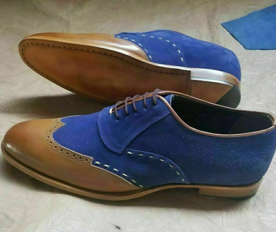 Made To Order Men Wing Tip Tan Blue Suede Real Leather Handmade Lace Up Shoes