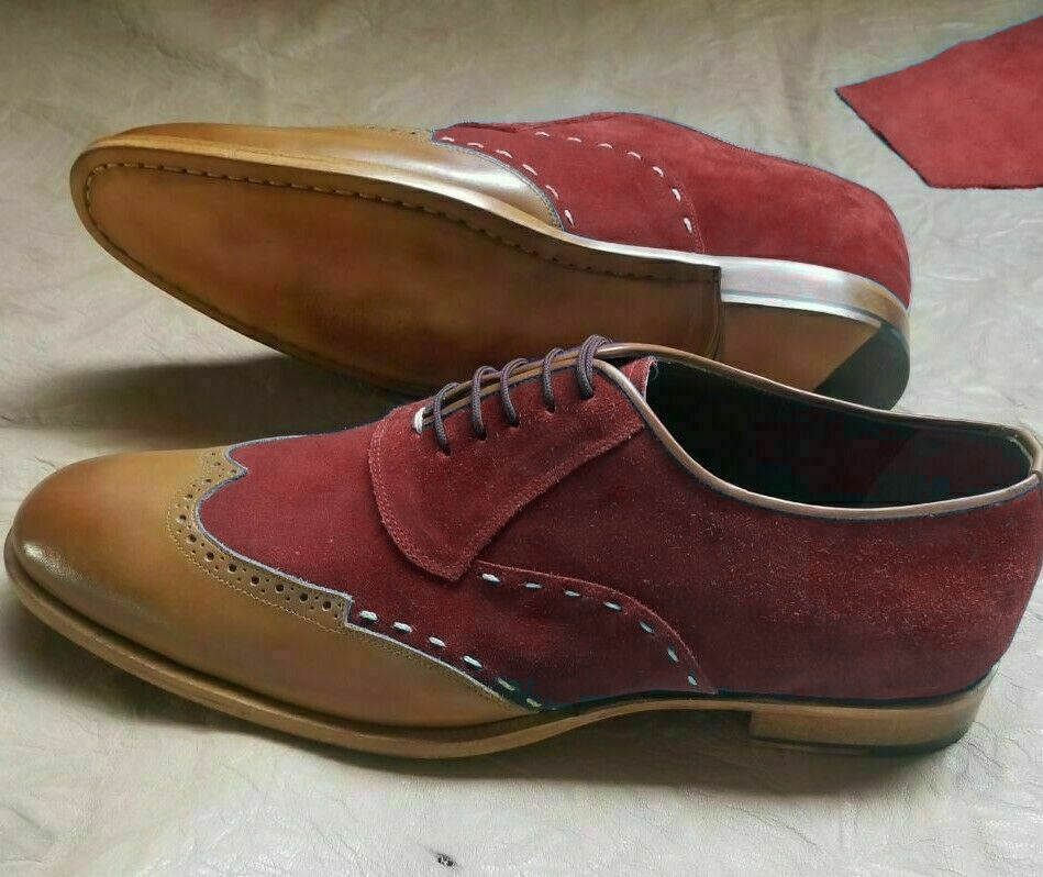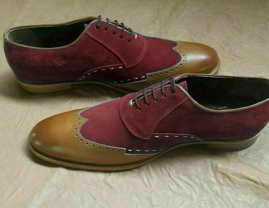 Maroon Tan Oxford Genuine Suede Leather Wing Tip Handmade Lace Up Men Fashion Shoes