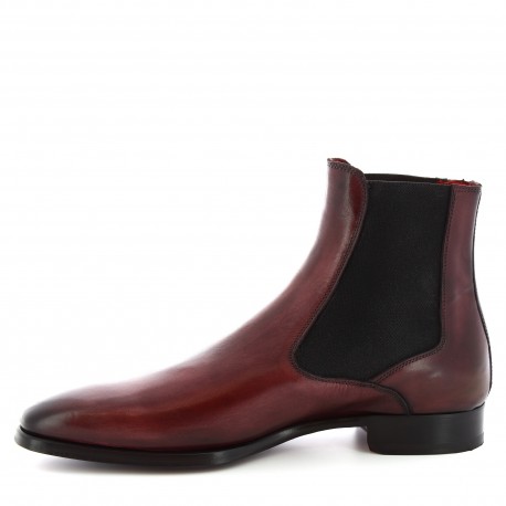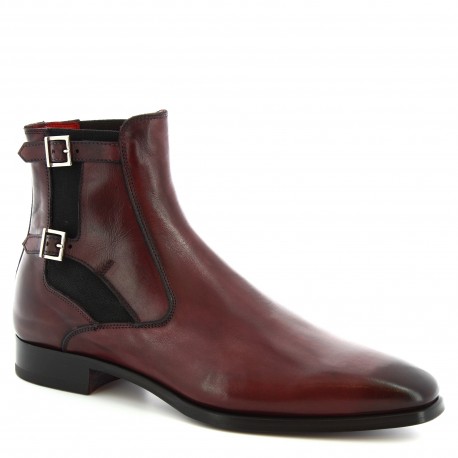Rounded Double Buckle Strap Chelsea Maroon Genuine Leather Derby Toe Handmade High Ankle Boots