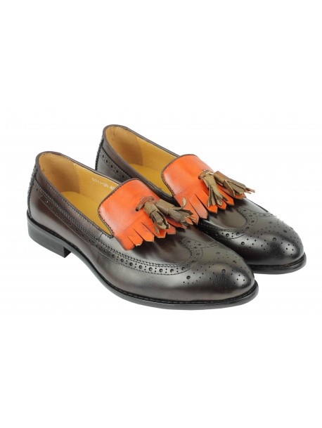 Men Two Tone Orange Black Loafer Tassel Genuine Leather Wing Tip Fringed Brogue Toe Handmade Shoes
