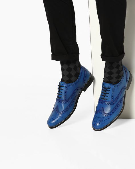 Wing Tip Blue Genuine Leather Full Brogue Lace Up Handmade Men Oxford Shoes