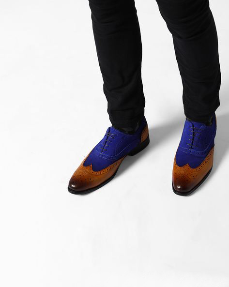 Navy Blue Suede Brown Genuine Leather Wing Tip Handmade Brogue Toe Lace Up Fashion Shoes