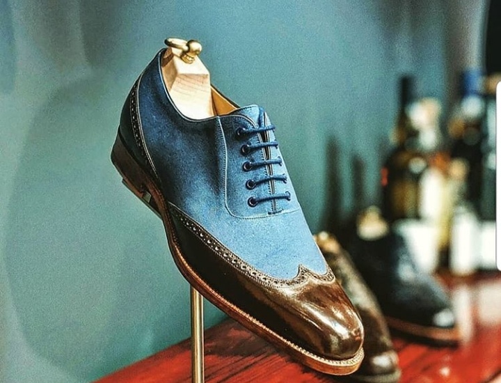 Spectator Oxford Blue Suede Brown Genuine Leather Handmade Men Wing Tip Lace Up Shoes