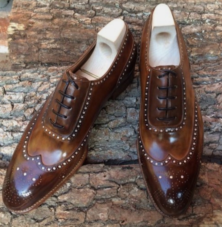 Brown Oxford Genuine Leather Brogue Toe Lace Up Handmade Wing Tip Men Shoes