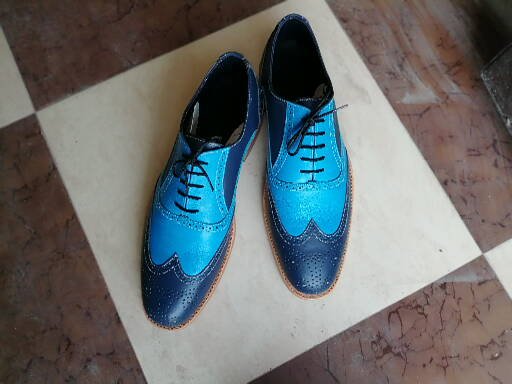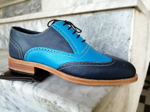 Oxford Two Tone Blue Genuine Leather Medallion Toe Wing Tip Handmade Shoes