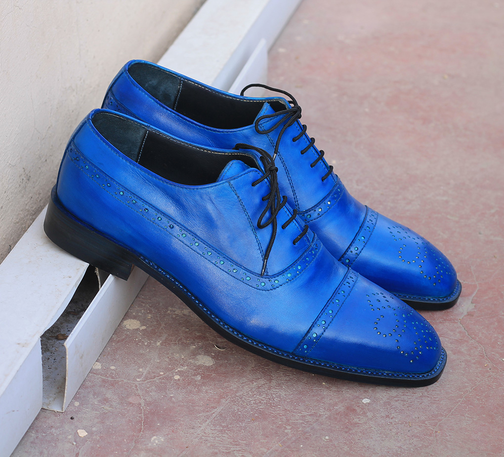 Royal Blue Vintage Leather Medallion Cap Toe Handmade Lace Up Oxford Shoes