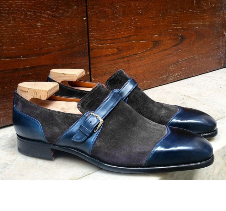 Monk Black Suede Single Buckle Strap Blue Genuine Leather Derby Cap Toe Fashionable Shoes