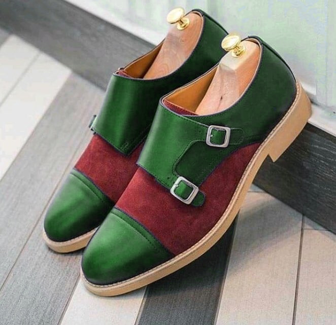 Double Buckle Strap Maroon Suede Green Genuine Leather Derby Cap Toe Handmade Monk Shoes