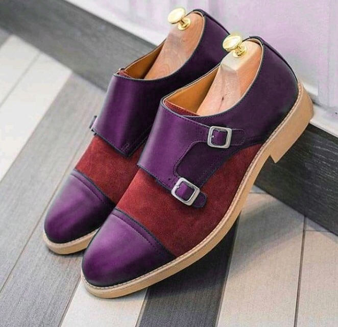 Maroon Purple Monk Double Buckle Strap Suede Real Leather Derby Cap Toe Handmade Tan Sole Shoes