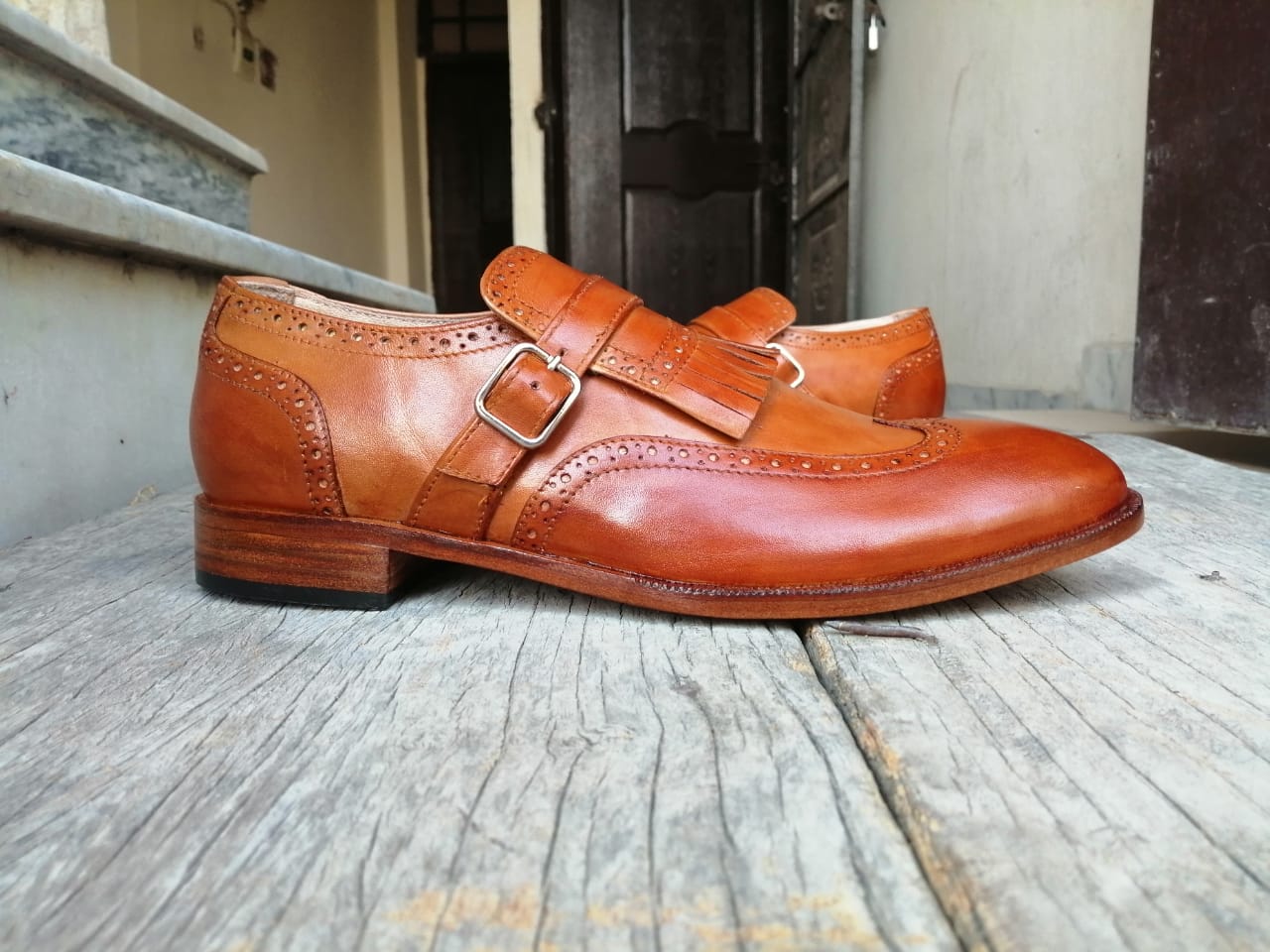 Brown Fringes Vintage Leather Single Buckle Monk Strap Handmade Wing Tip Fashion Shoes