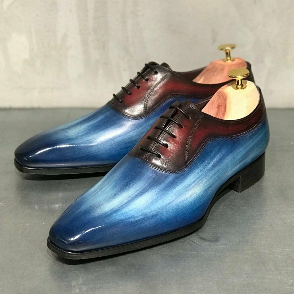 Oxford Blue Brown Patina Hand Painted Real Leather Derby Toe Lace Up Black Sole Shoes