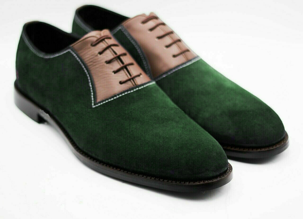Two Tone Oxford Green Suede Tan Genuine Leather Lace Up Rounded Derby Toe Handmade Men Shoes