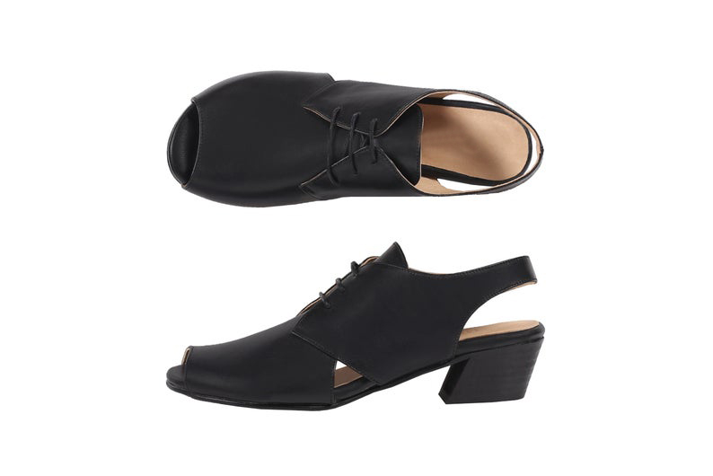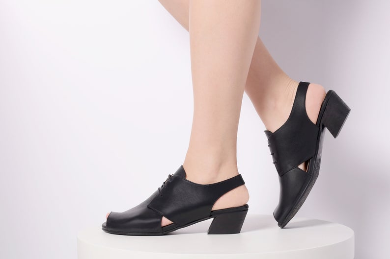 Women Black Low Heel Peep Toe Genuine Leather Lace Up Classic Sandals