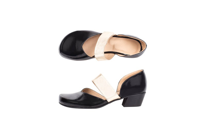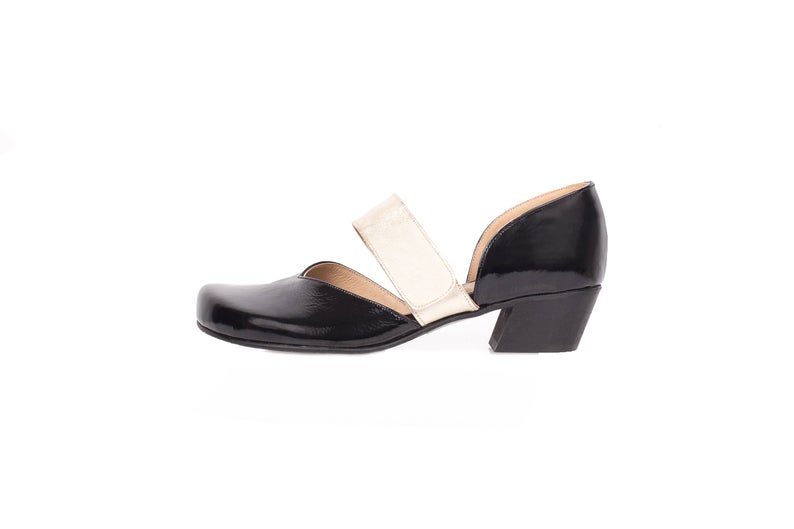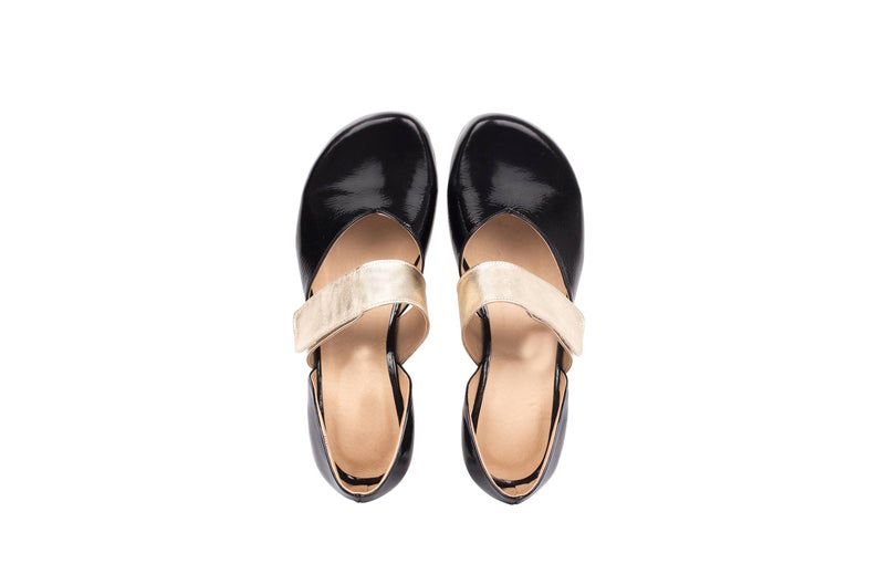 Women's Black Low Heel Patent Leather Golden Strap Handcrafted Stylish Shoes