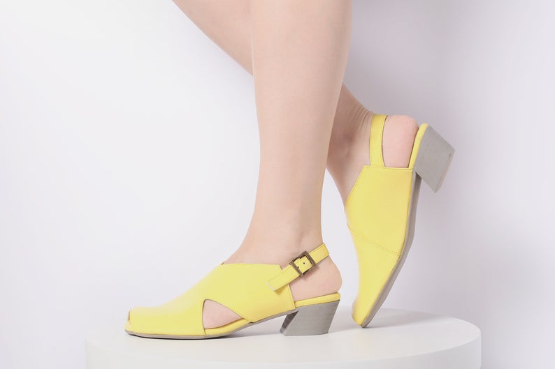 Women's Yellow Peep Toe Low Heel Buckle Strap Real Leather handmade Fashion Sandals