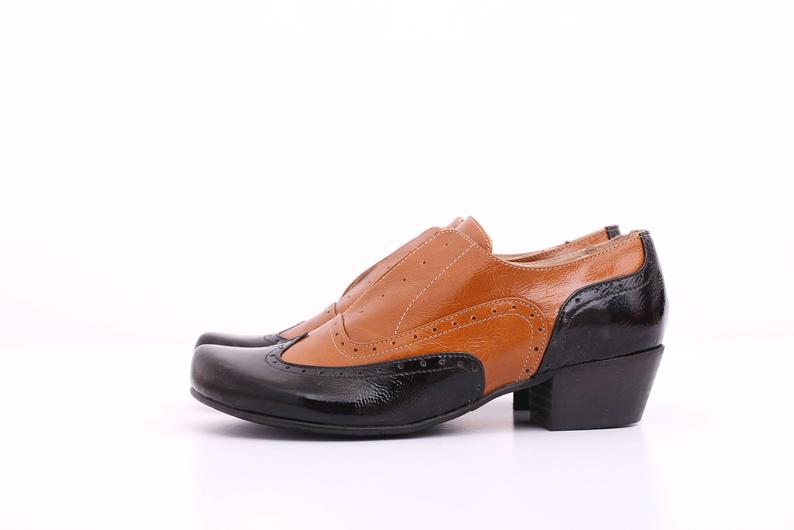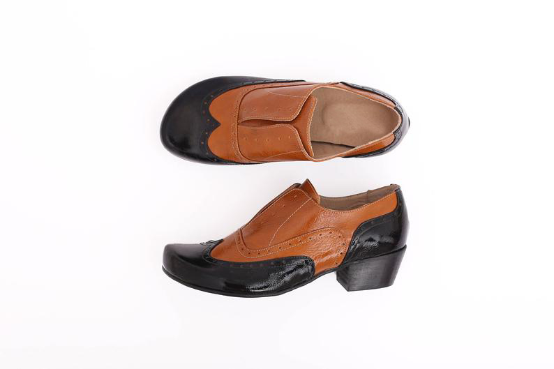 Two Tone Womens Black Camel Brown Patent Patent Leather Handmade Oxford Shoes