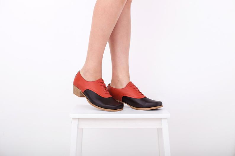 Two Tone Red Black Oxford Cuban Low Heel Handmade Stylish Women Shoes