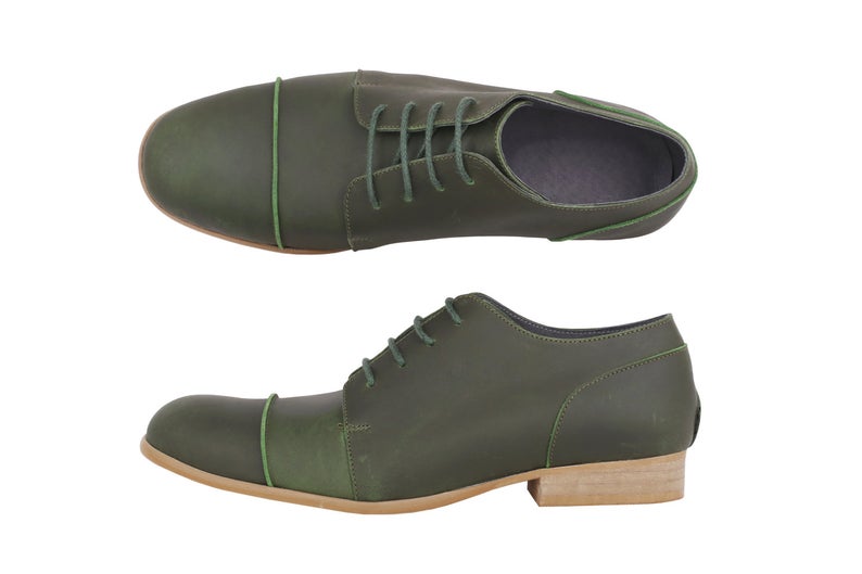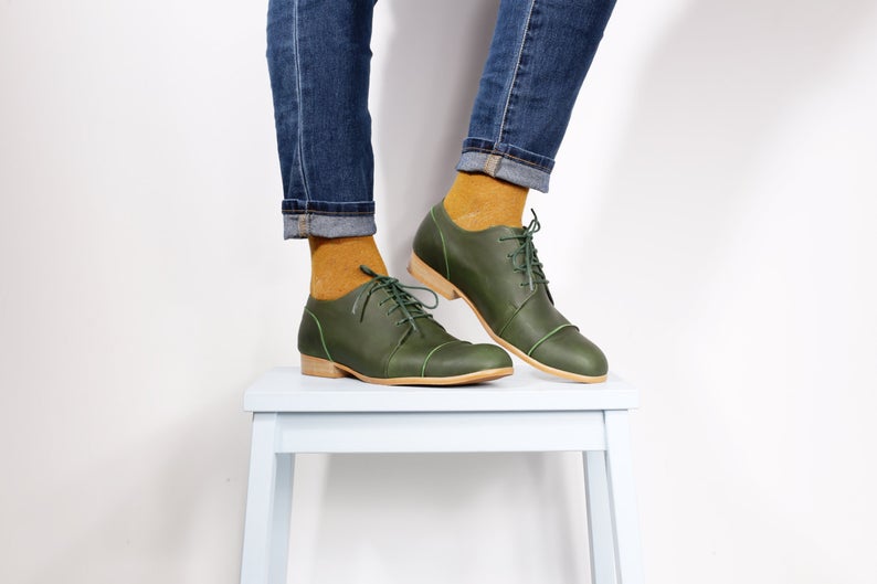 Women's Green Oxford Cap Toe Lace Up Leather Handmade Shoes