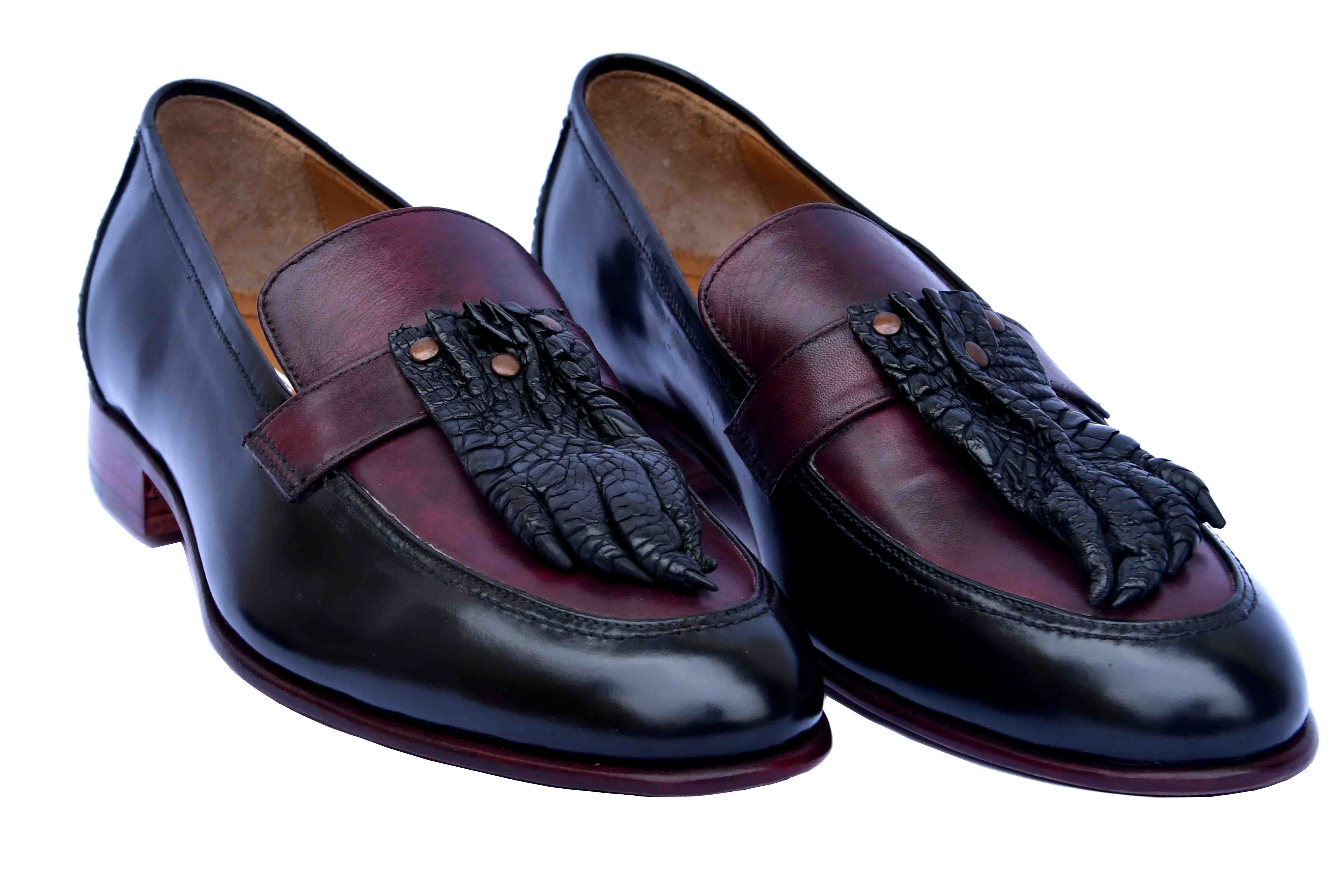 Fully Hand Made Products Prepared From Genuine Leather Luxury Castro Red & Black Apron Toe Loafer Genuine Crocodile Leather Men Formal Shoes Premium Quality Pairs Castro Red & Black Color Out Class Apron Toe With Genuine Crocodile Leather Paw On Vamp Infallible Good Year Welted Sole Stable Slip On Loafer Style Superb Grip With Back Stay Heel Counter Elegant Lower Heel For Smooth Walking Prepared From 100% Genuine Leather Concocted For Men Boulevard Formal Shoes Available In Three Different Sizes US 8, US 8.5 & US 9 Qualities: Premium Quality Full Grain Leather Hand Crafted Boots, Upper Made With Full Tanned Flawless Part Of Calf Skin, Lining Of Quality Sheep Skin, Inner Of Quality Shank Board, Real Leather Vegetable Tanned Leather Soles, Hand Stitched Good Year Welted Soles With Bead Around The Soles To Make Them Water Proof, Made For Last Long With Time And Care, Heels Made With Multi Layers Of Real Animal Skin, Heel Tip Full Rubber, You May Ask For A Winter Or Summer Pad Under Soles (Optional), You May Ask For A Logo Or Initials To Be Included On Your Shoe/Boot, And Inner Soles Of Quality Leather. You May Ask For Any Other Customization In Shoes Or Boots. Free Shipping Worldwide.