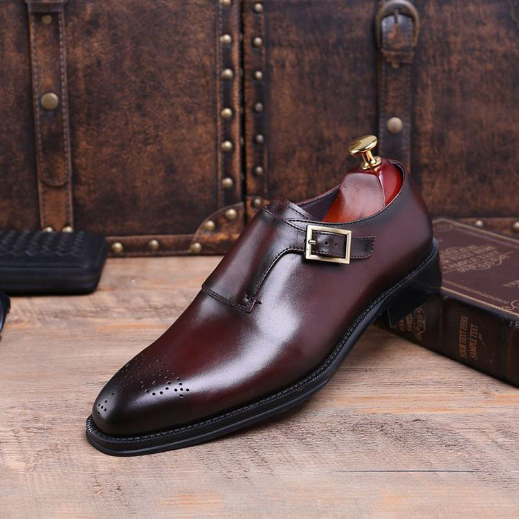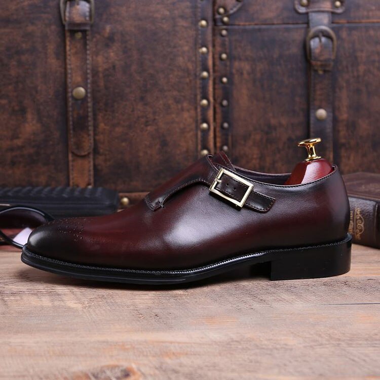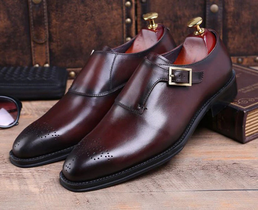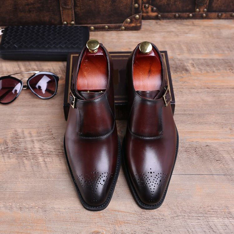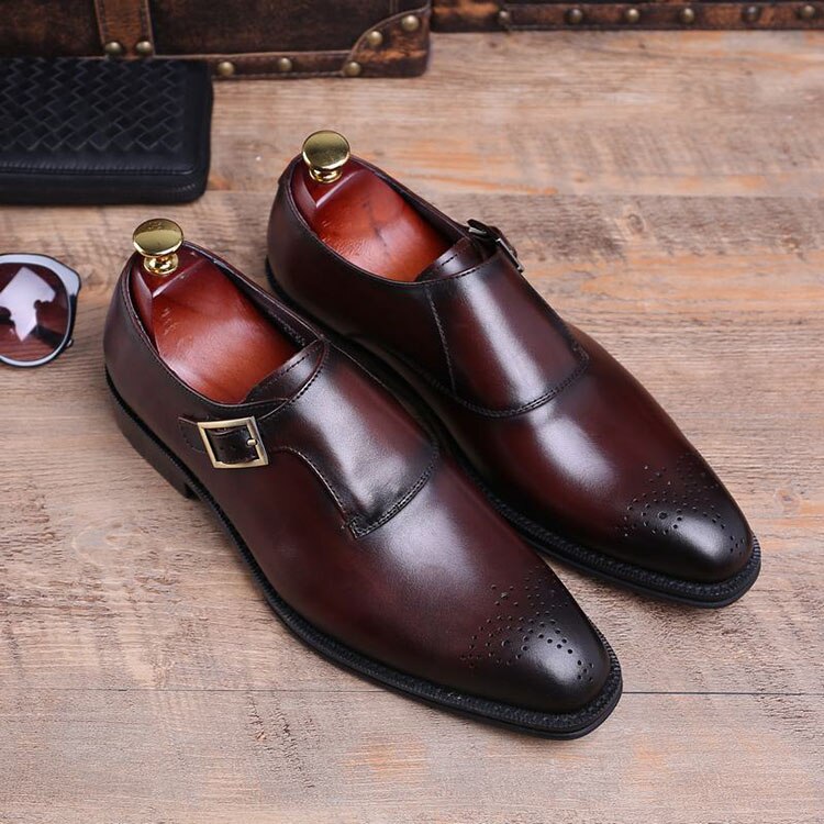 Superior Handmade Monk Strap Brown Brogue Patent Real Leather Men Formal Shoes