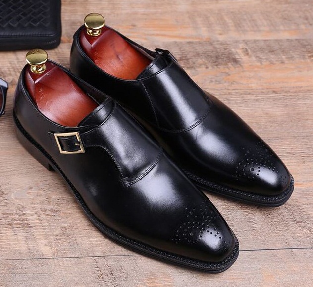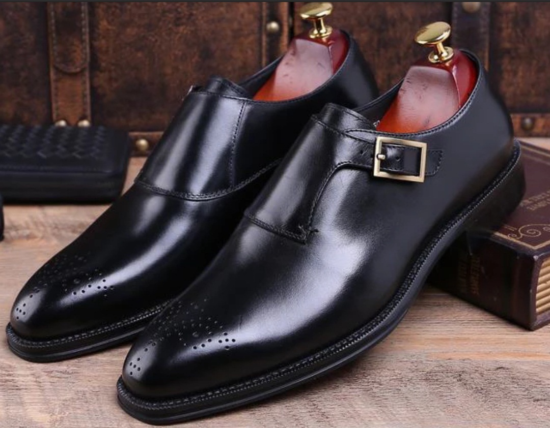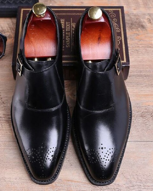 Elegant Monk Strap Medallion Toe Handmade Black Real Leather Men Formal Shoes