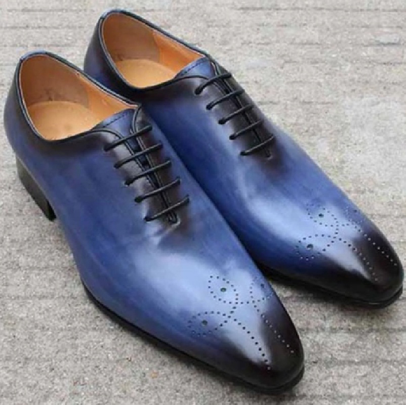 Oxford Blue Brogue Toe Patina Handmade Leather Wholecut Men Lace Up Formal Shoes 7-16