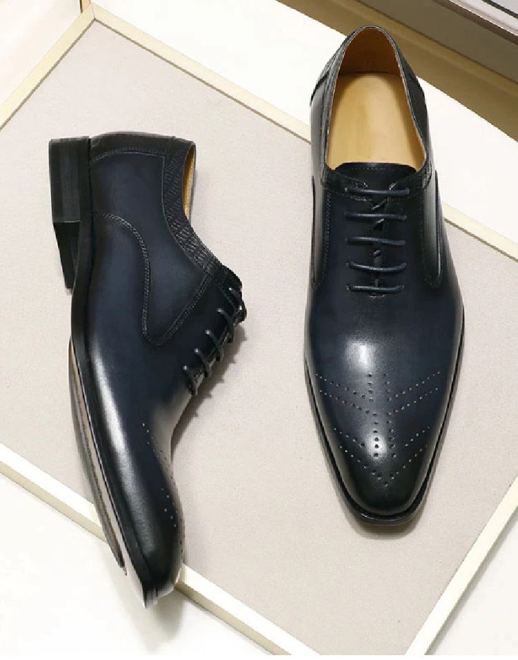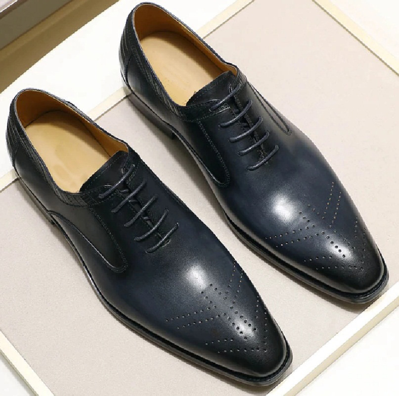 Oxford Navy Blue Brogue Pointed Toe Real Leather Handmade Lace Up Formal Shoes