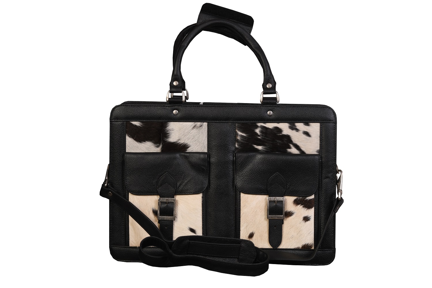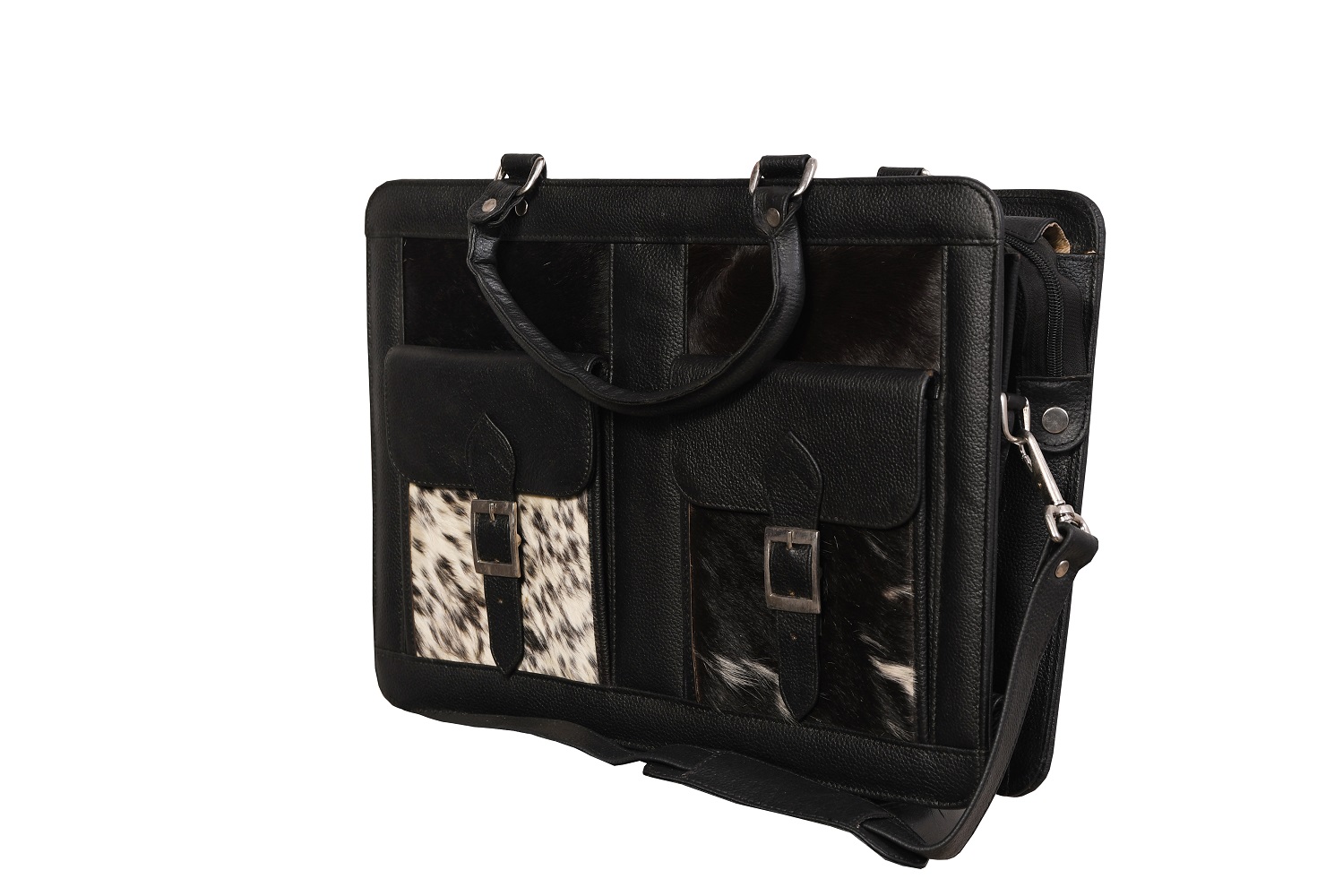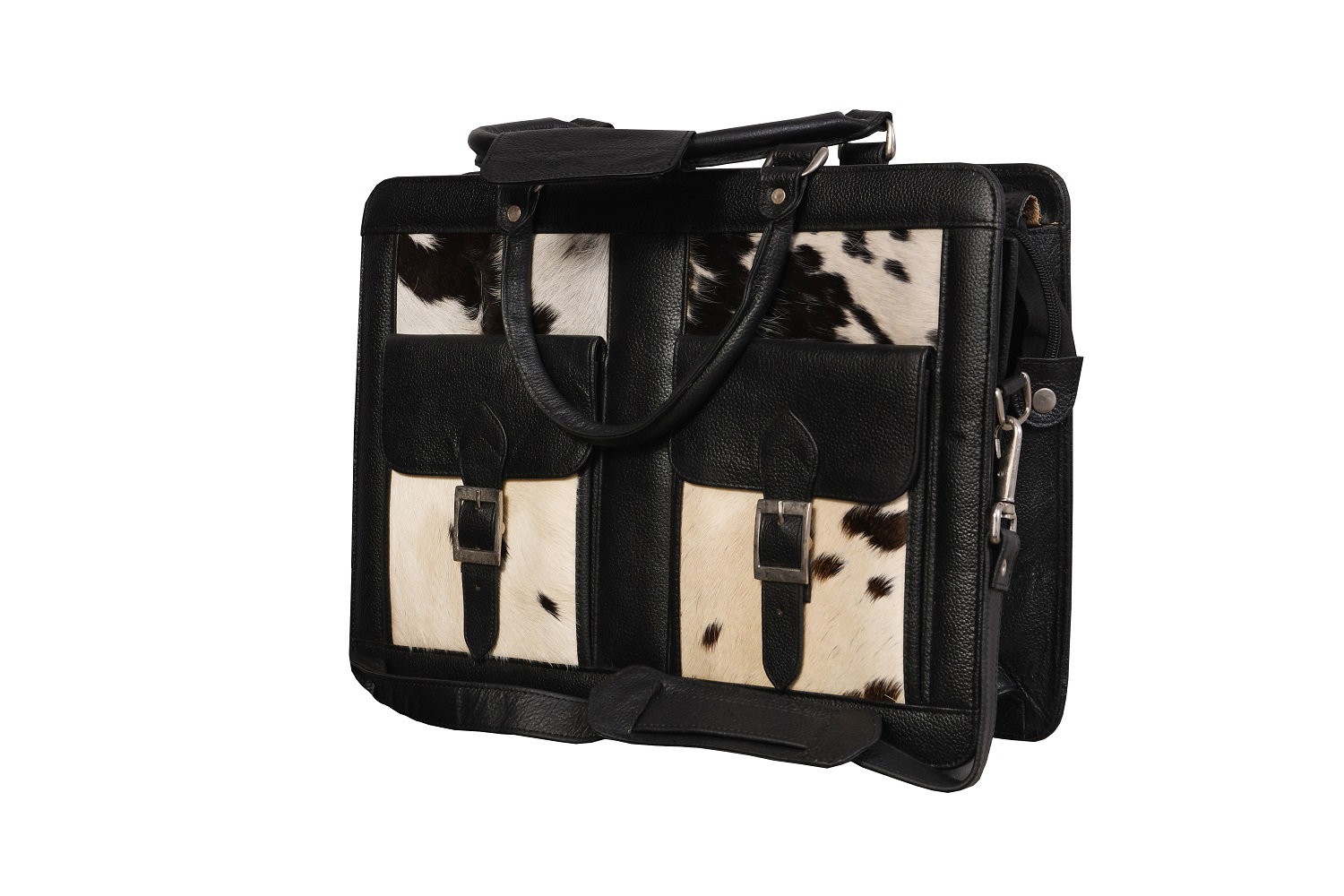 Handmade Messenger Cow Hair-On Brief Case, Travel Cowhide Leather Bag, Dual Buckle Pockets Cross Body Belted Laptop Bag,