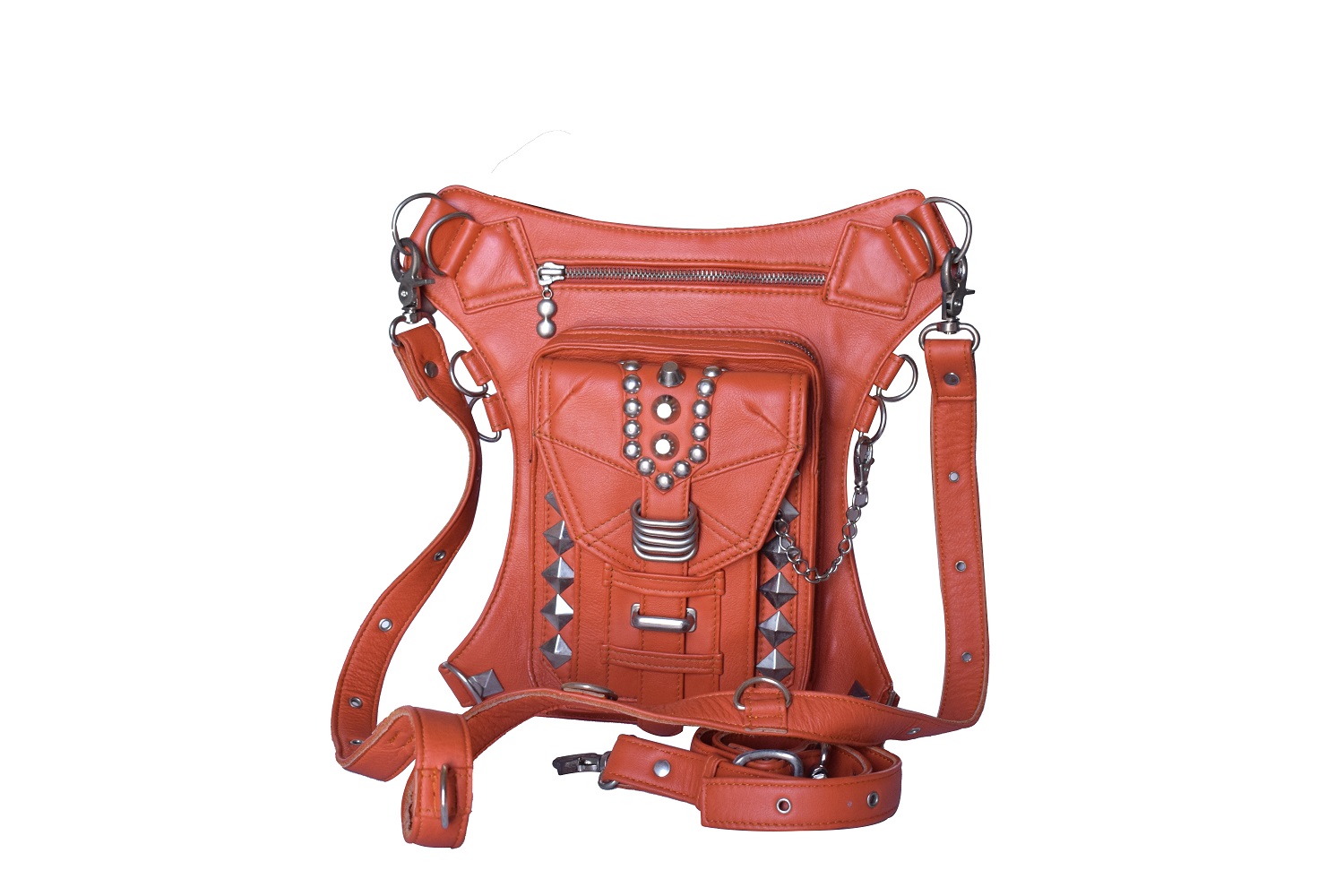 Unisex Studs Backpack, Handmade Leather Holster Bag, Orange Waist Hip Travel Bag