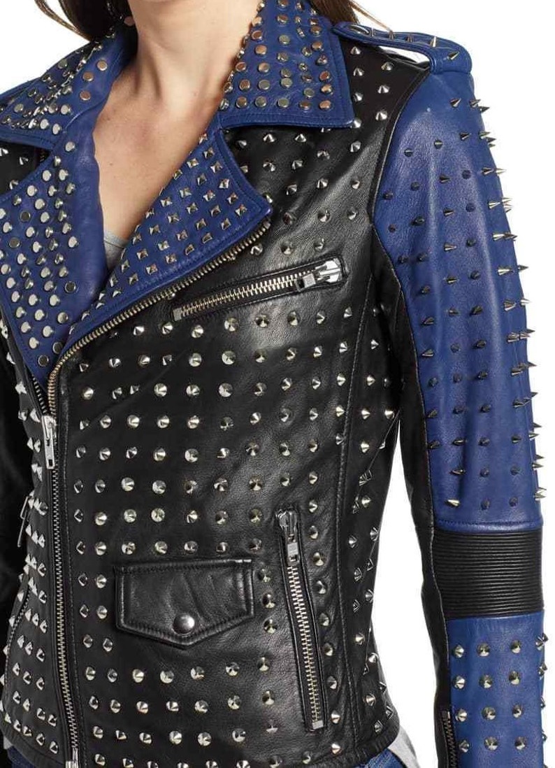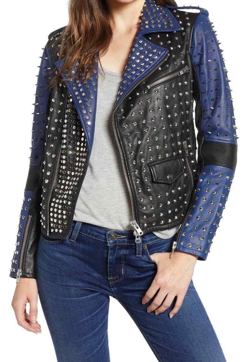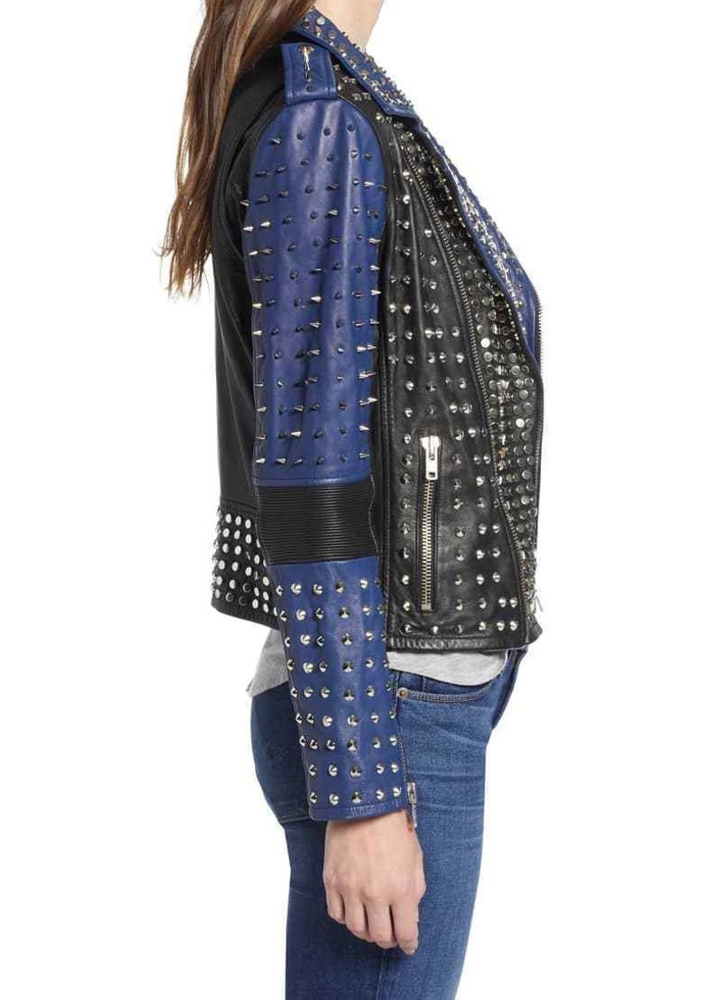 Women's Two Tone Blue Black Blue Contrast Genuine Leather, Women Blue studded Jacket, Silver Spike Studded Jacket Studded Biker Zipper Jacket,