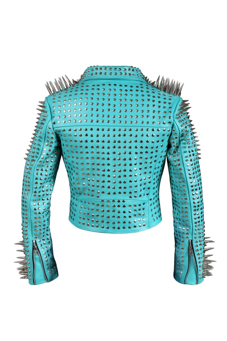 Heavy Metal Long Spiked Jacket, Waist Belt, Handmade Silver Studded Motorbike Jacket, Personalized Light Blue Jacket, Steampunk Jacket,