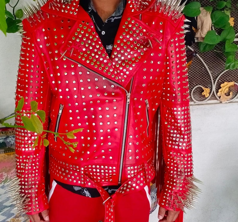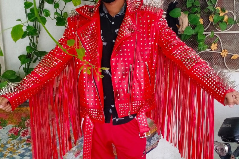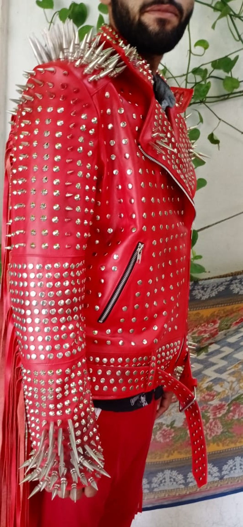 Personalized Men's Handmade Silver Spiked Studs, Red Fringed Cowhide Leather Jacket, Bikers Fringes Punk Jacket,
