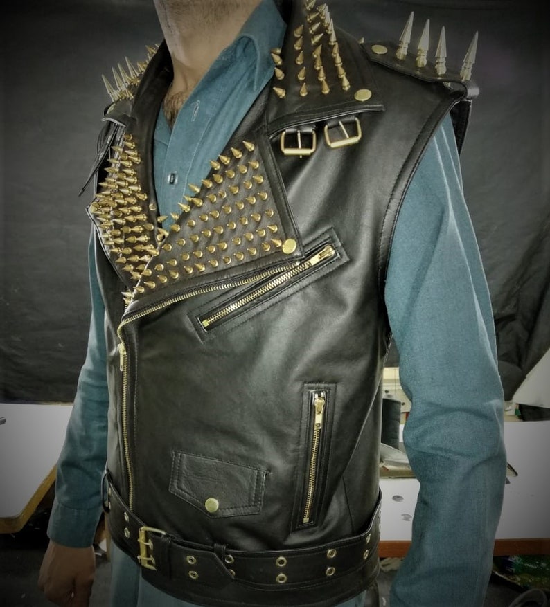 Punk Silver Long Spiked Studded Leather Buttons Up Vest Golden Studs Spikes Jacket, Handmade Men's Black Leather Vest Jacket,