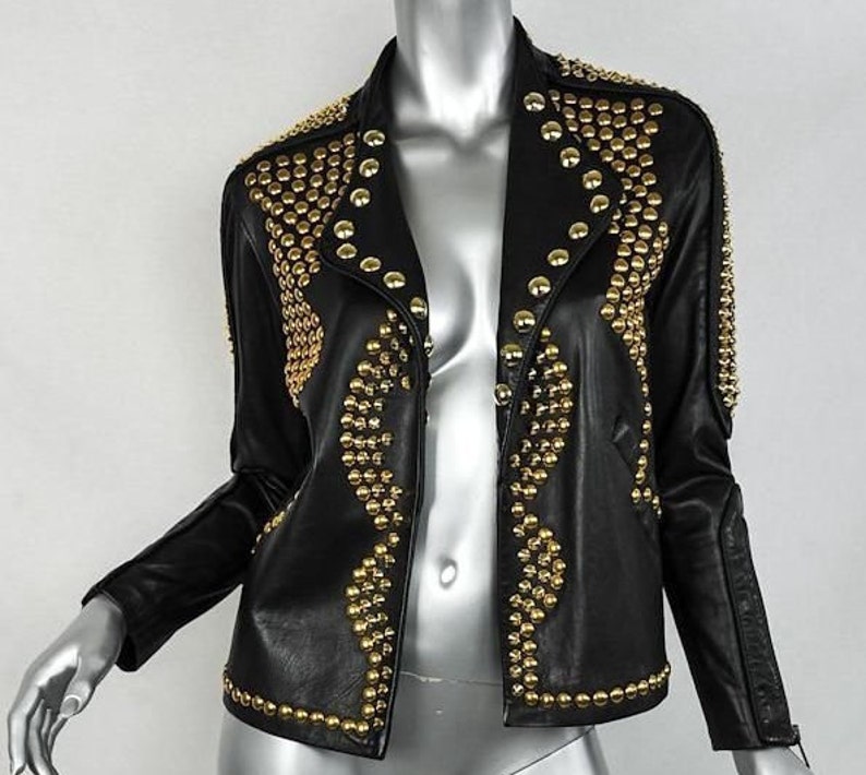 Steam Punk Golden Jacket, Dome Large Golden Studs Leather Jacket, Steam Punk Rocker Girl Jacket, Women Golden Studded Leather Jacket,