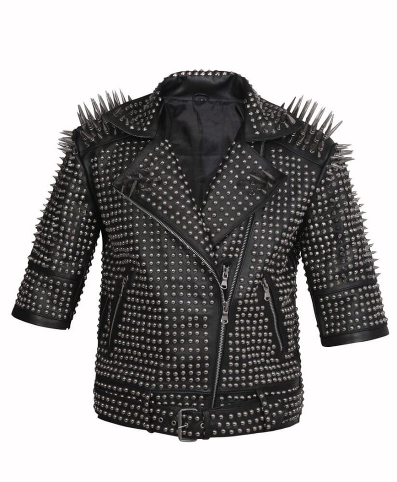 Handmade Motorcycle Jacket, Long Spiked Three Quarter Sleeves Jacket, Bikers Gothic Jacket, Metal Silver Studs Personalized Fashion Jacket,