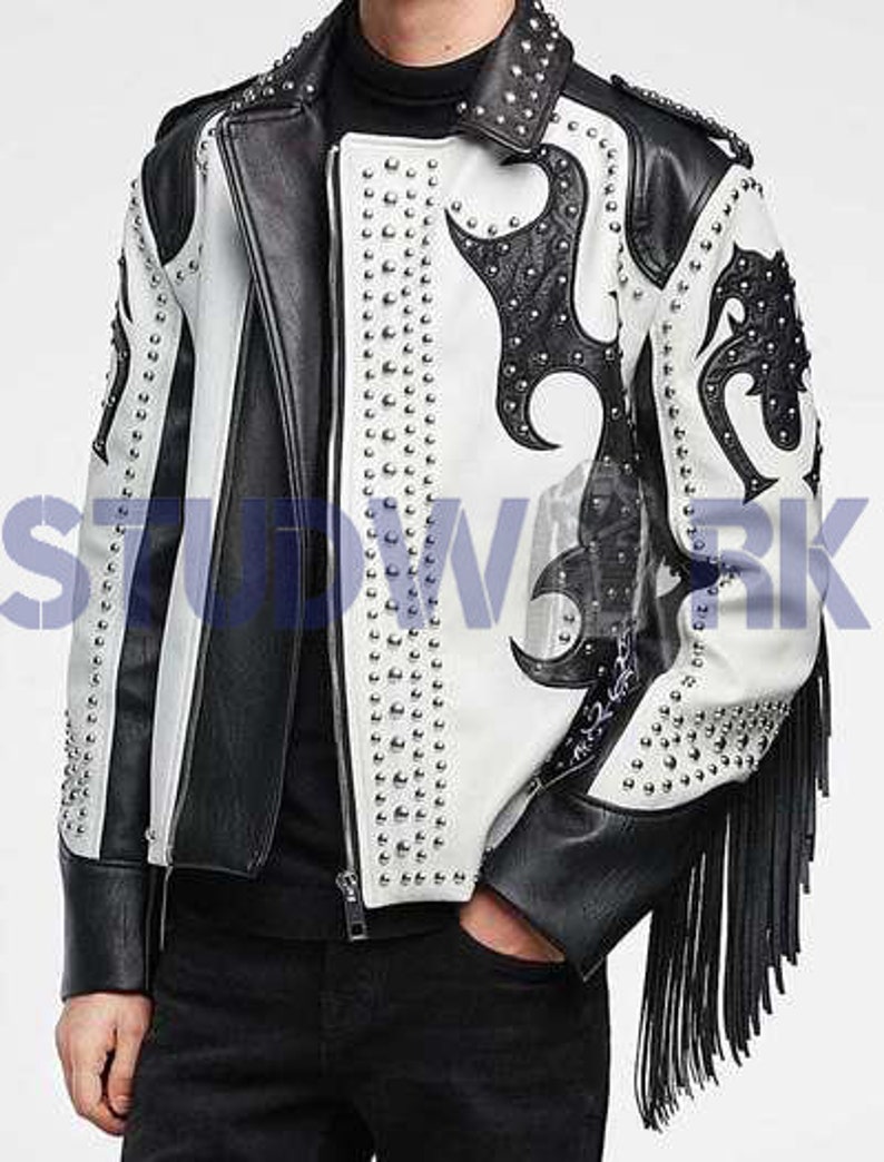 Bikers Two Tone Leather Jacket, White Cont Cowhide Leather Fringes Jacket, Handmade Silver Metal Studded, Men Western Style Studs Jacket,