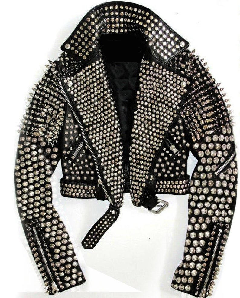 Black Brando Women's Full Studded Jacket, Waist Belted Black Leather Rock, Steam Punk Studded Bikers Jacket, Silver Spiked Studs Jacket,