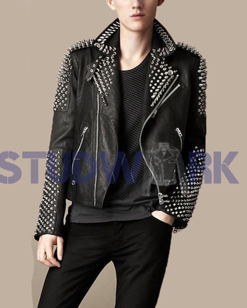 Personalized Cowhide Leather Jacket, Men's Studded Bikers Jacket, Black Slim Fit Handmade Punk Studded Spiked Lapel Collar Jacket,