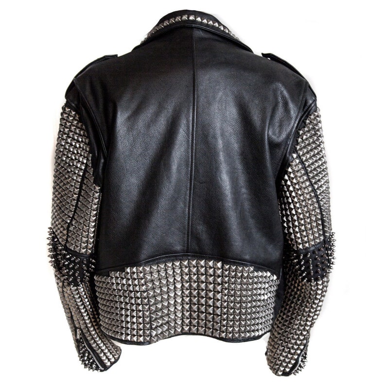 Handmade Men's Silver Heavy Pyramid Studded Jacket, Personalized Leather Bikers Jacket, Shoulder Epaulets Steam Punk Rockers Belted Jacket,