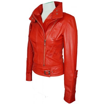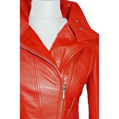 Bomber Women's Fashion Jacket, Orange Color Premium Leather Double Button Lapel Collar, Motorcycle Brando Front Zipper Belted Jacket,