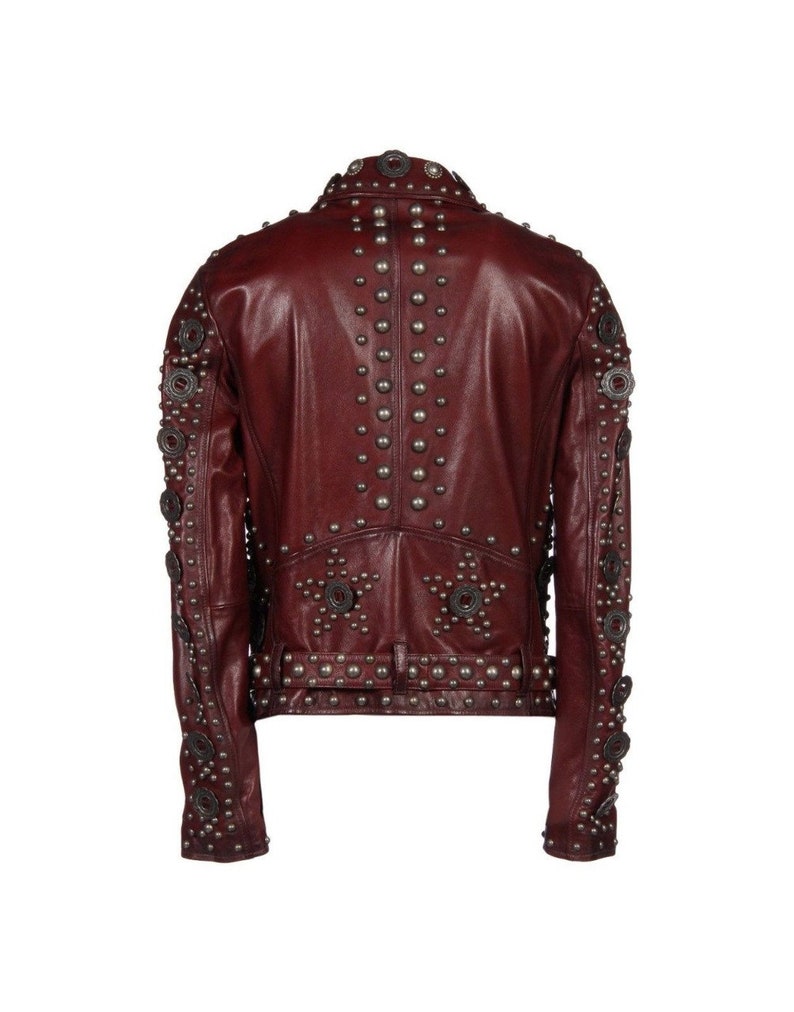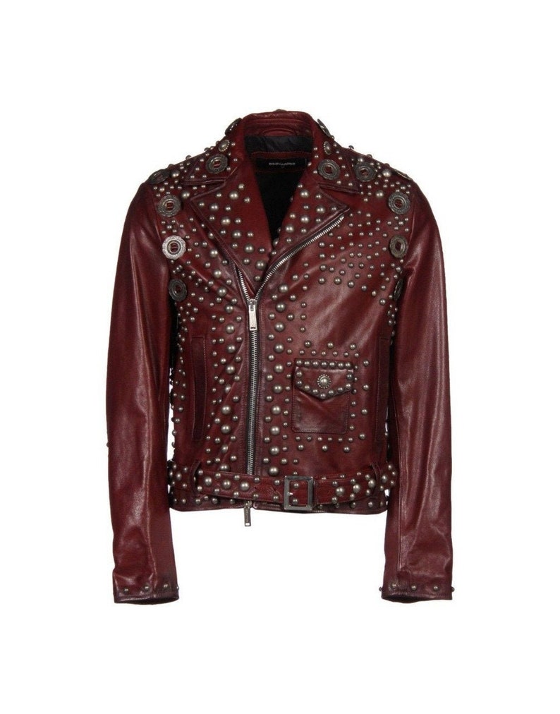 Handmade Burgundy Waist Belted Jacket, Personalized Silver Studded Jacket, Premium Leather Punk Jacket, Lapel Collar, Bikers Round Studs Jacket,