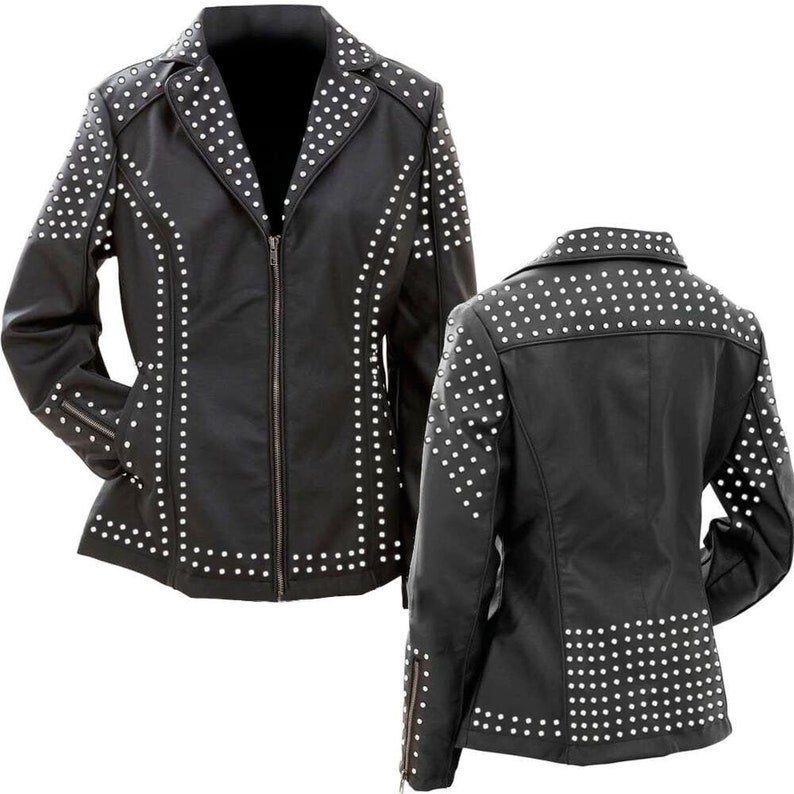Customize Black Coat, Silver Studs Personalized Coat Jacket, Women Handmade Zippered Punk Jacket, Cowhide Leather Coat,