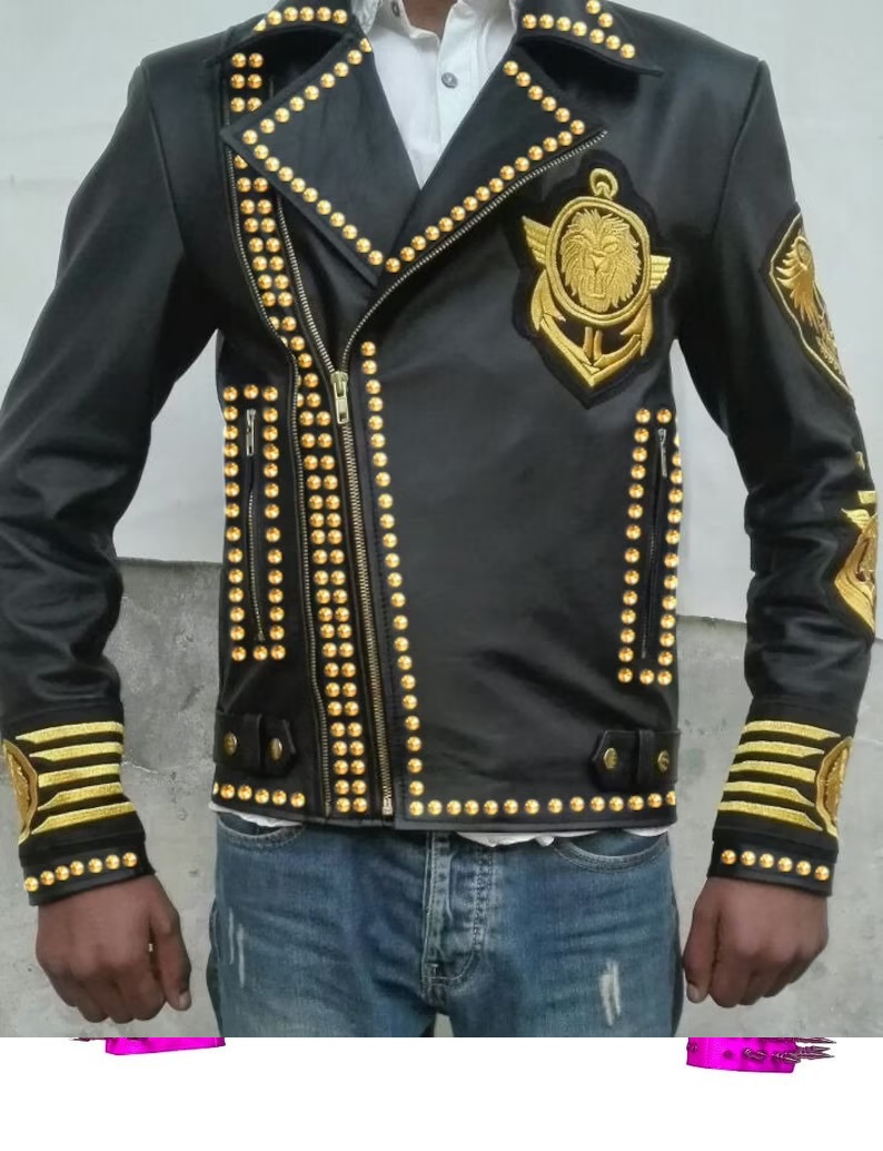 Made To Order Captain's Golden Studded Brando Jacket, Lapel Collar Motor Bike Jacket, Customize Motorcycle Studded Jacket,