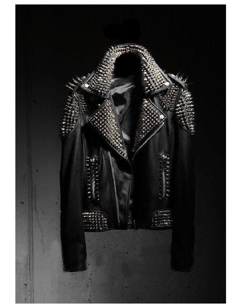 Black Color Spiked Punk Jacket, Shoulder Epaulets, Made To Hand Cow Skin Leather Jacket, Silver Studded Punk Jacket, Bikers Fashion Jacket,