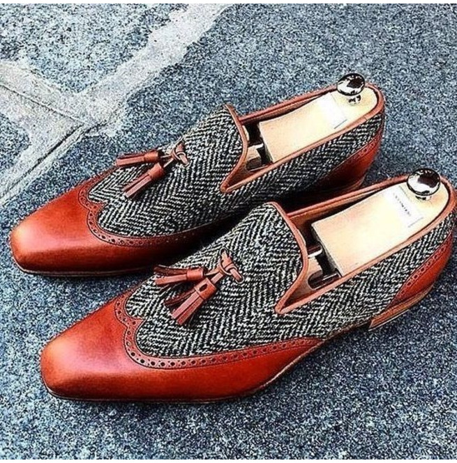 Made To Hand Tweed Tassels Loafer Shoes, Patina Wingtip Leather, Formal Shoes,